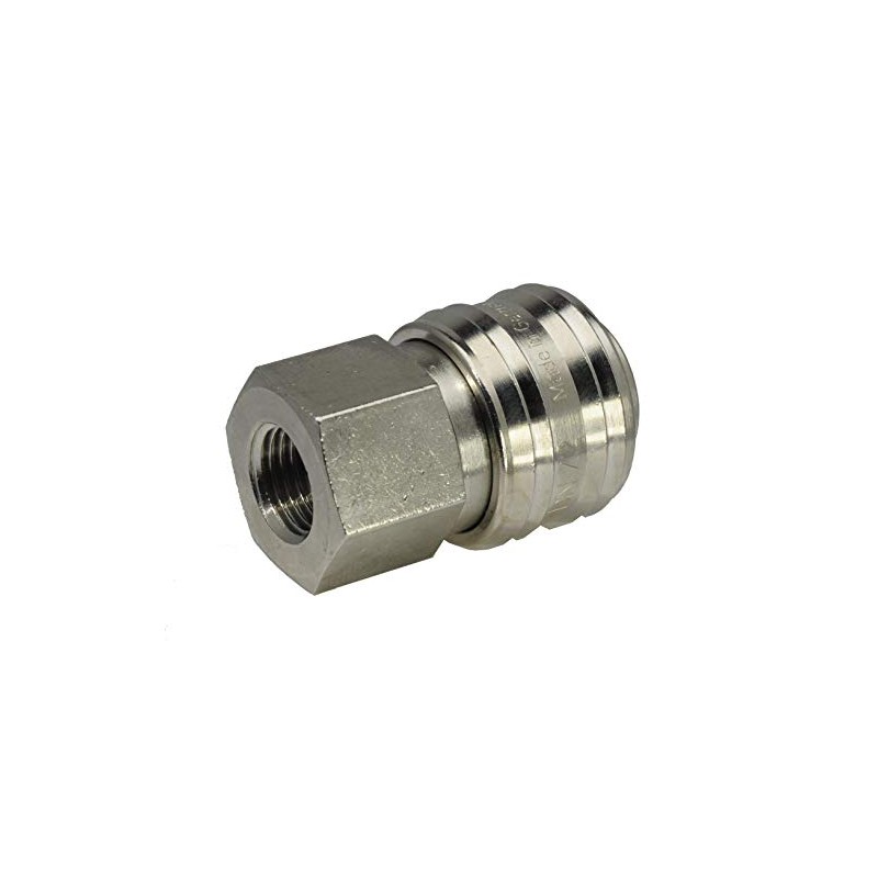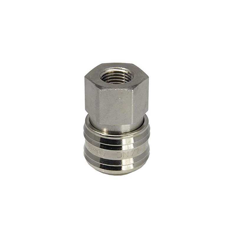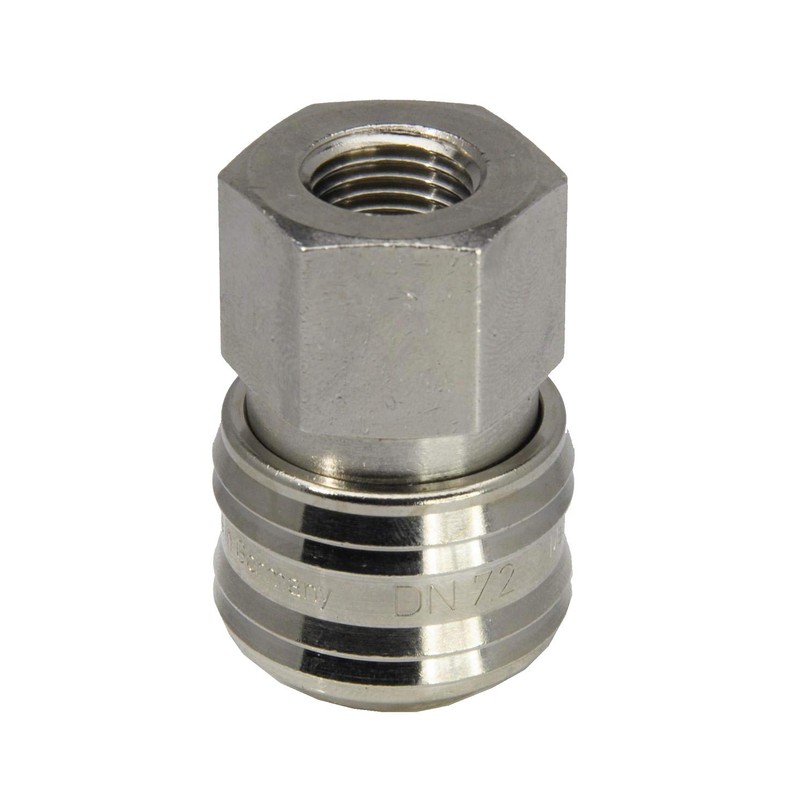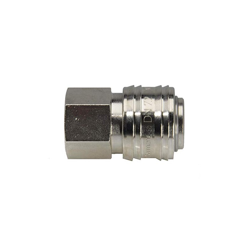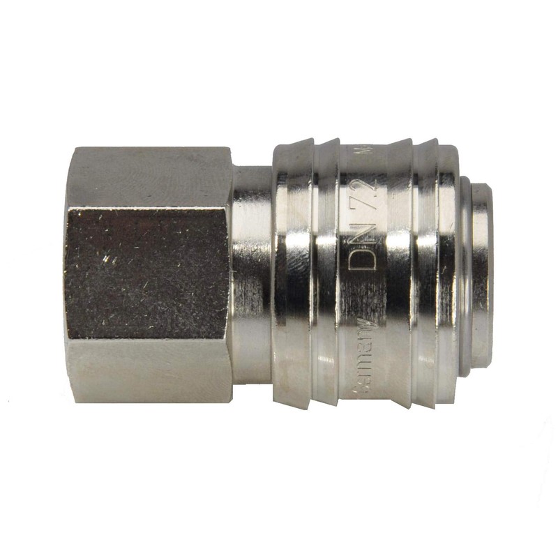 Compressed air coupling socket NW 5 with internal thread, brass, nickel-plated brass, hardened steel, stainless steel, industrial quality, temperature range: -20 °C to max. +100 °C (stainless steel: -15 °C to max. +200°C). Operating pressure: -0.95 to 35 bar