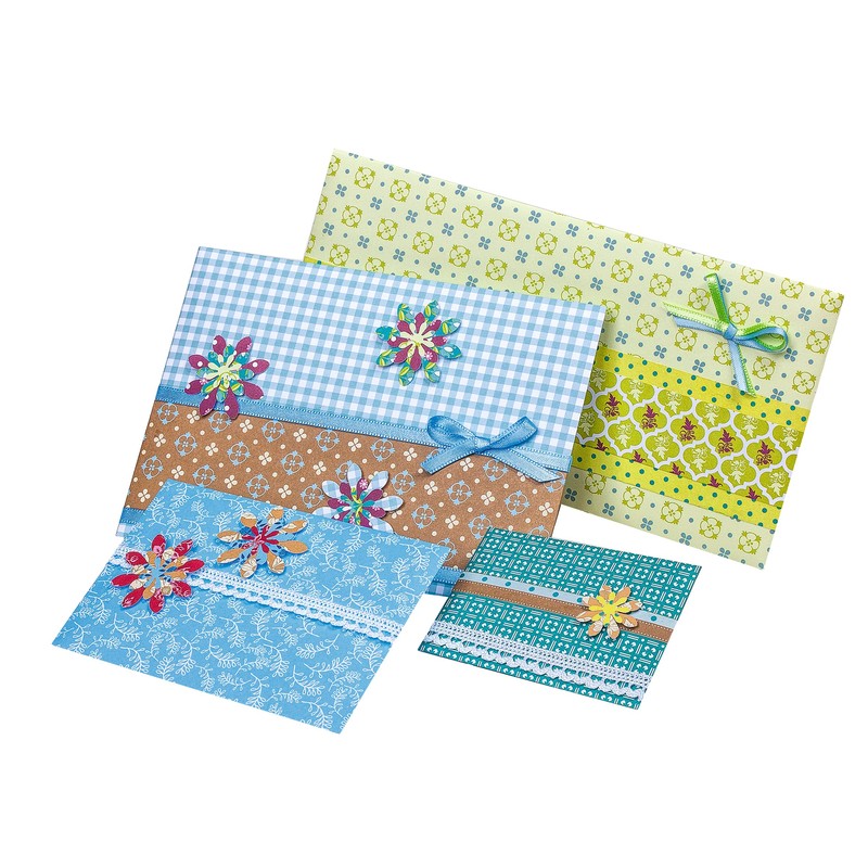 Make and design your own envelopes for special occasions with the stencil set. For example, use straw silk, beads, lace ribbon, punch or stamp. The set is versatile for many different materials. Let your creativity run wild and design a matching card for your envelope, for example for confirmation, birthday, christening or a beautiful Christmas card.