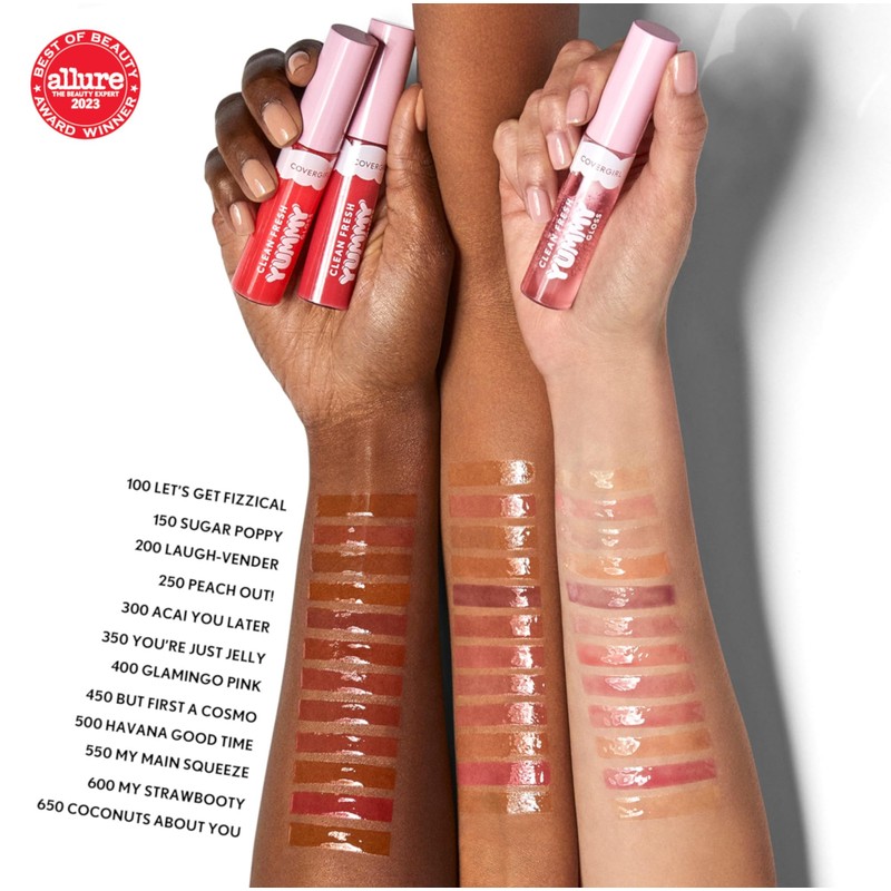 Uncover the secret to supple, scrumptious lips in a single swipe with Covergirl Clean Fresh Yummy Gloss. Infused with naturally derived antioxidants and hyaluronic acid for instant hydration, this Covergirl lip gloss makes your pout feel nourished, fuller and healthier. Cruelty- and gluten-free, the vegan formula of our tinted lip gloss is deliciously scented with naturally sourced Pink Berry Citrus, Coconut Water or Red Pineapple, respectively. Available in 12 sheer shades, its doe-foot applicator applies the perfect amount of shiny gloss for juicy lips all day long. Based on a consumer study of 110 women after one week of use: ? 98% say lips feel instantly hydrated ? 97% say the lip gloss glides on smoothly ? 96% say the hydrating gloss makes lips feel nourished ? 95% say lips look instantly supple and smoother after just one swipe ? 91% say the natural scents smell deliciously yummy