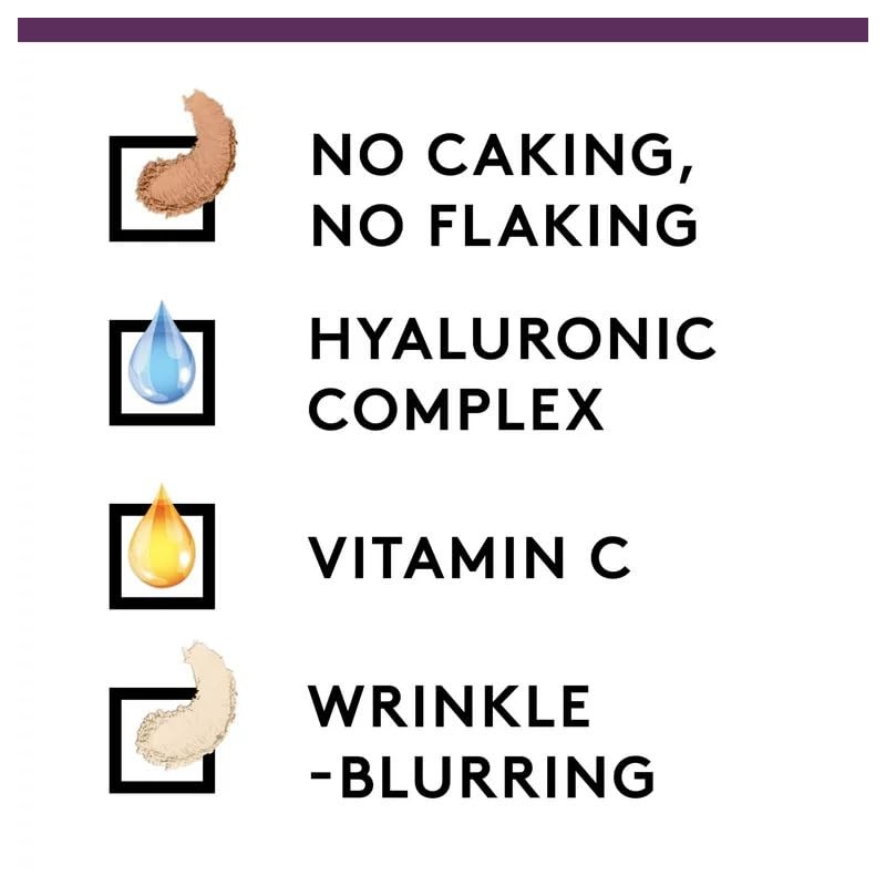 Instantly reduce the look of fine lines and wrinkles with Covergirl Simply Ageless Instant Wrinkle Blurring Pressed Powder. This hydrating face powder goes on creamy and does not cake or flake for a flawless finish. The pressed makeup powder is formulated with hyaluronic acid and vitamin C to refresh the complexion and even out skin tone. Perfect for on-the-go touch-ups, the matte pressed powder makes pores less visible and floats over fine lines and wrinkles to deliver youthful-looking skin. Pro-tip: Use this pressed powder to set your Simply Ageless Foundation!