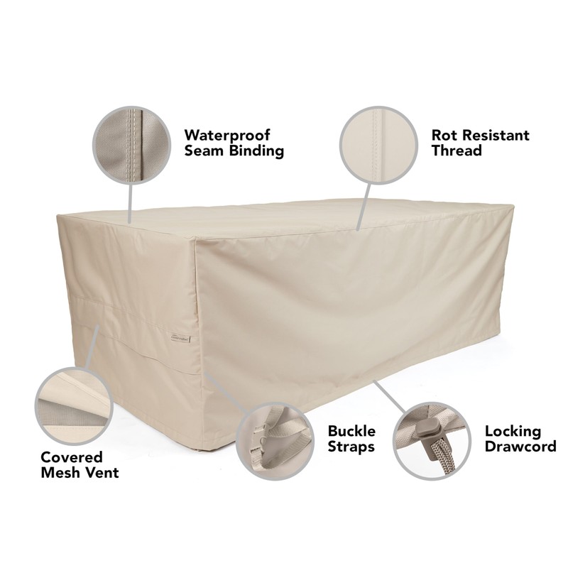Sharing meals with family and friends on your outdoor patio creates wonderful memories. Whether it's a birthday, graduation, happy hour, or finally, it's a weekend celebration; you'll want to be certain that your dining table is in perfect condition to host your party! Covermates Ultima Table Covers are engineered from sturdy 600D solution-dyed polyester with a ripstop grid pattern offering exceptional tear strength. It is made to resist tearing, ripping, cracking, fading, and scratching. An adjustable drawcord around the bottom seam cinches to make the cover snug. An added buckle strap on each side of the cover and down the middle is included for extra durability during extreme weather conditions. Rot-resistant double stitched seams with waterproof binding create extra durability. The built-in covered mesh vent allows airflow to prevent trapped water. By investing in a Covermates Ultima Table Cover, you ensure exceptional protection of your patio table.