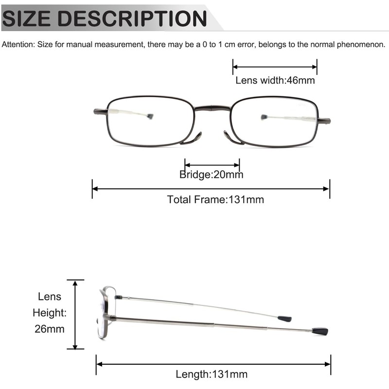 - 【Product Size:】Frame width 5.16 inches (131mm); Lens width 1.81 inches (46mm); Lens height 1.02 inches (26mm); Frame height 1.10 inches (28mm); Bridge (DBL) 0.83 inches (21mm); Temple length 5.20 inches (132mm). There is a measurement error of about 1%.