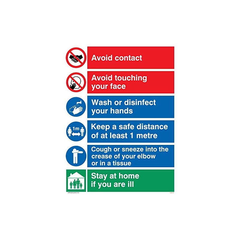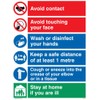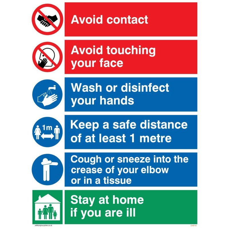 - Sign text: Avoid contact. Avoid touching your face. Wash or disinfect hands. Keep a safe distance of at least 1 metre. Cough or sneeze into the fold of your elbow or into a tissue. Stay at home when you are sick.