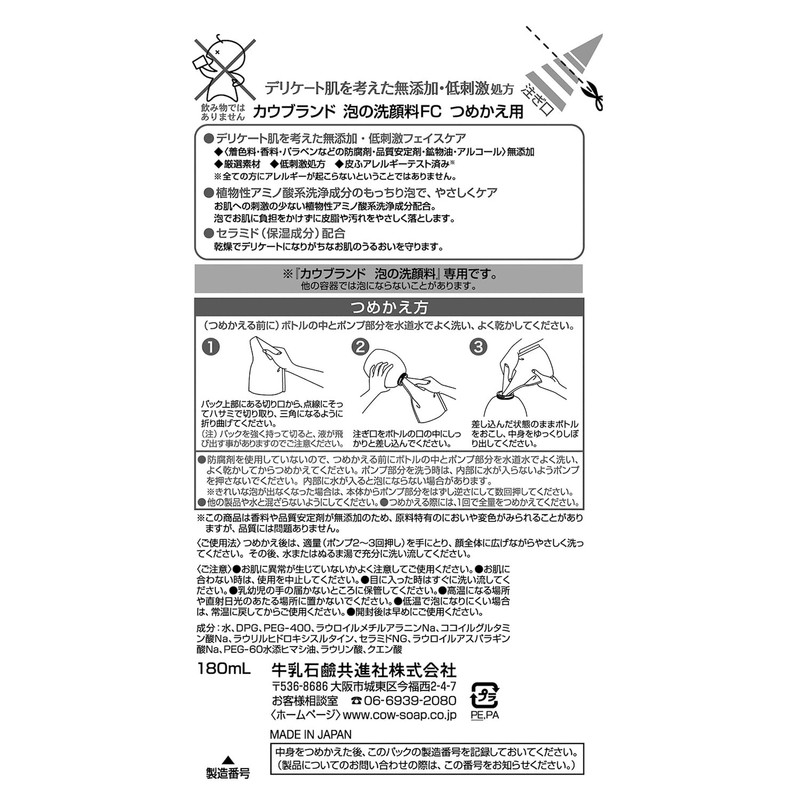 Cow Brand Additive-Free Foaming Facial Cleanser, Refill, 6.1 fl oz (180 ml) x 2, 6.1 fl oz (180 ml) x 2