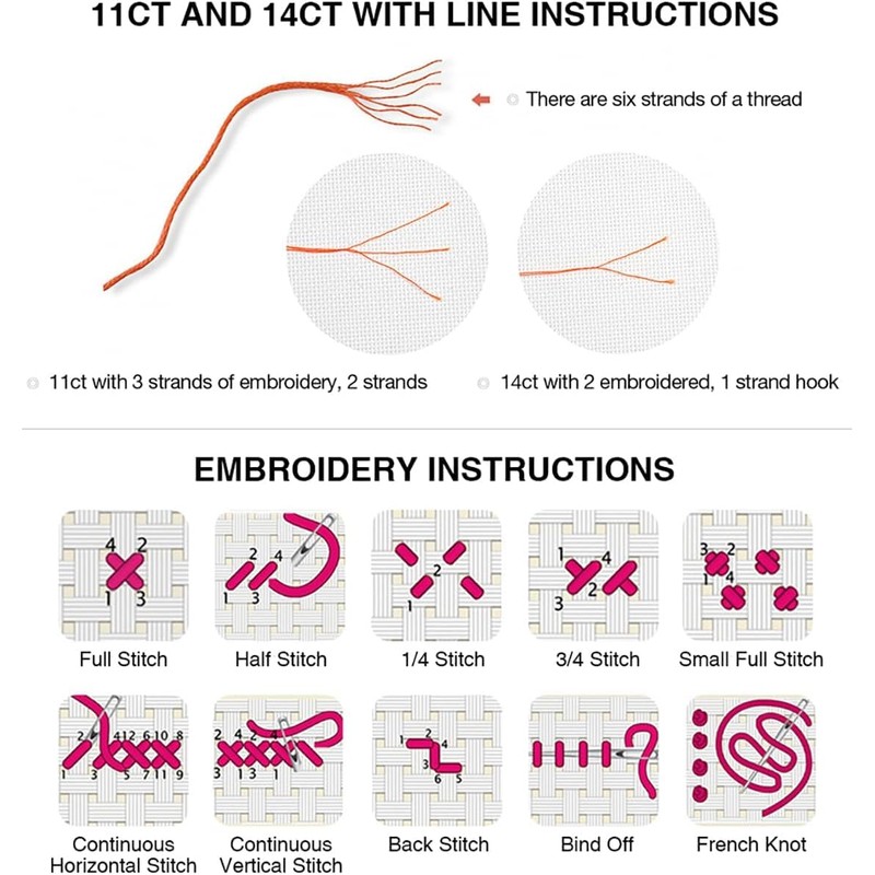 • 【Size and Package】13.8x13.8 inch,2pc cross stitch needles, enough thread already sorted, English instructions,cross stitch patterns instructions,and 11CT Pre-printed stamped cross stitch fabric cloth.