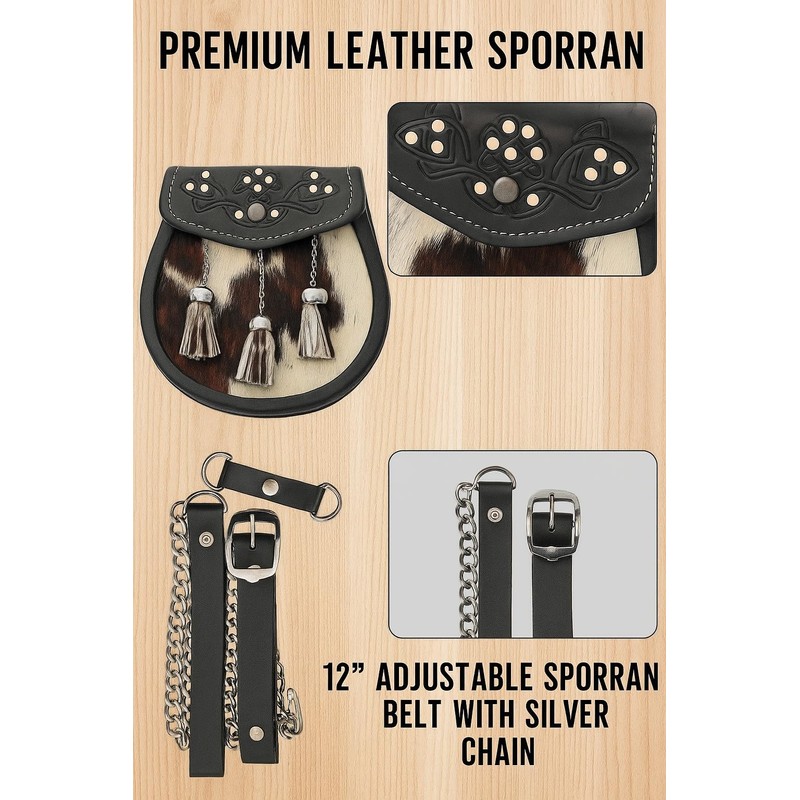 - 🐄 GENUINE COWHIDE LEATHER WITH NATURAL HAIR TEXTURE – RUSTIC AND DURABLE: Expertly handcrafted from real cowhide skin with natural hair-on-hide finish, making each sporran uniquely textured and patterned. Durable leather construction resists wear and adds an authentic rustic look, perfect for reenactments, pipe bands, and formal Scottish dress.