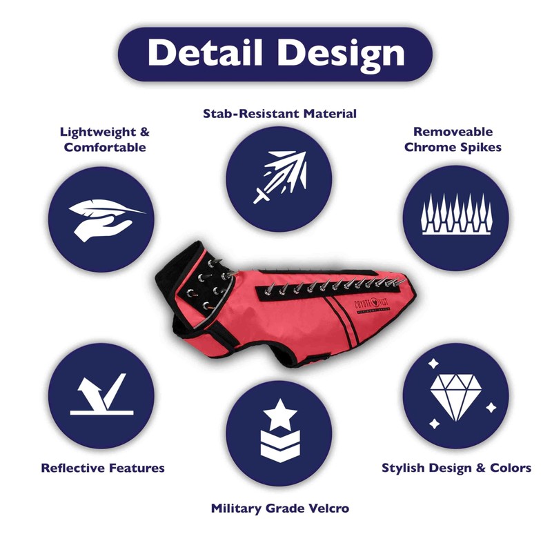- NECK AND BODY PROTECTION: SpikeVest includes a vest with removable chrome spikes; Neck spikes and 2 strips of spikes for the back. Made with super tough puncture resistant Cordura fabric that's stab-resistant to withstand the sharp canine teeth of coyotes and aggressive dogs.