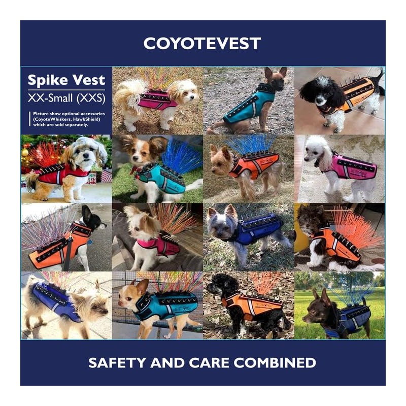 - COYOTE DOG VEST: PLEASE READ SIZING GUIDE BEFORE PURCHASING! Like a CoyoteVest, the purpose of the SpikeVest is to help slow down or prevent a surprise attack and give you enough time to react before serious injury occurs. The main difference is the SpikeVest uses two wide belts with Velcro while the CoyoteVest uses nylon straps with snap buckles.