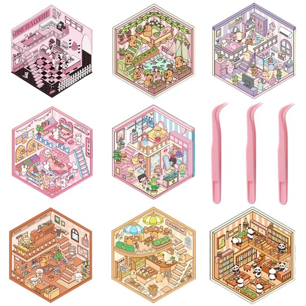 COYUN 8 Sets 3D House Stickers, Miniature House Stickers, 3D Sticker Scene, House Stickers Make Your Own, Relief Stress for Adults and Children A