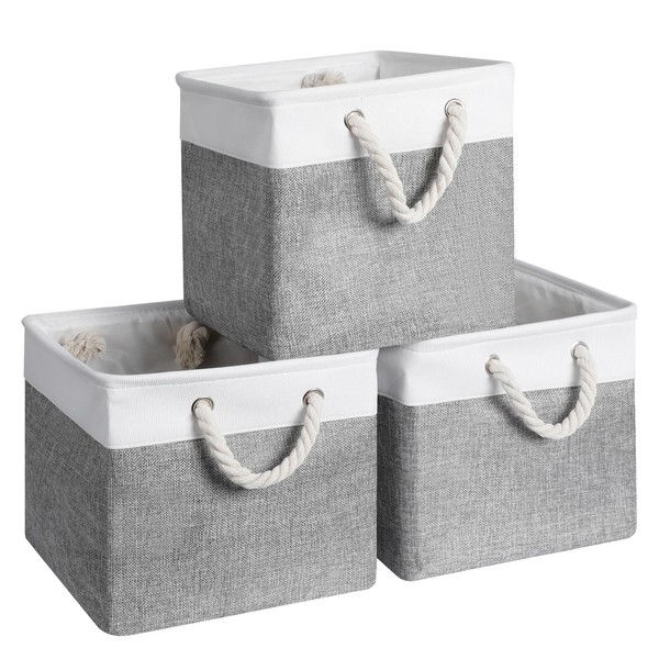 Cozary Storage Box Set 28 x 28 x 28 cm - Foldable - Storage Basket with Metal Insert and Cotton Handle - Fabric Storage Basket for Shelf, Cupboard and Clothes - Grey/White - Pack of 3