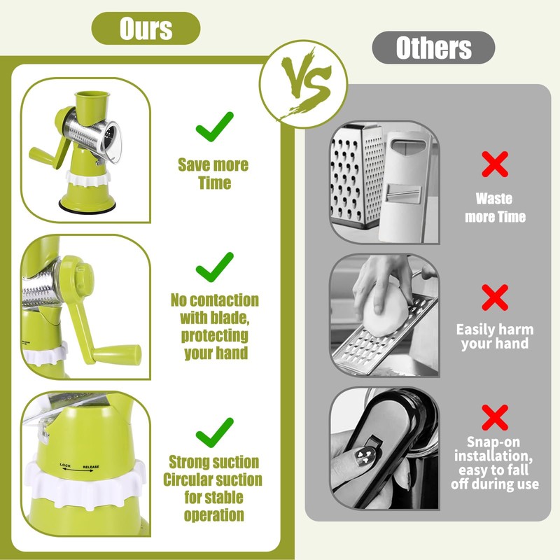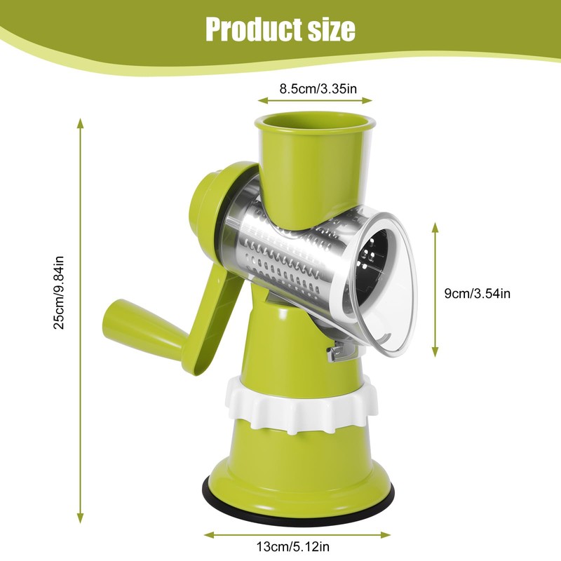 - 🍽️ Stable Base with Strong Suction Cup: Designed with a powerful suction base, this rotary grater stays firmly in place on your countertop, providing a stable and efficient slicing experience. The ABS body contributes to the lightweight yet sturdy feel, making it easy to operate without slipping. The thoughtful detachable design also makes cleaning and storage a breeze, keeping your kitchen neat and organized.