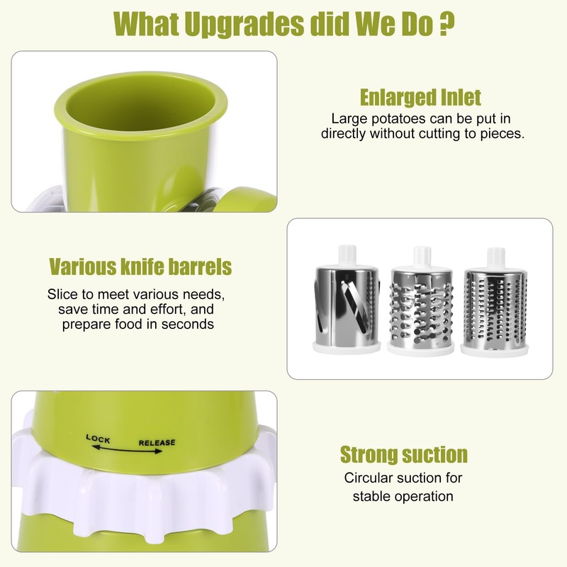 Unlike typical slicers that are hard to clean and often unsafe, our slicer features a rotating design with three interchangeable drum blades, made from durable ABS and stainless steel. The sleek green color adds a fresh, modern touch to your countertop.