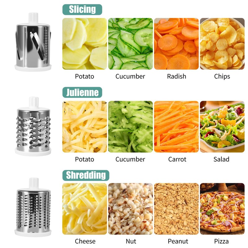- 🥕 Versatile 3-in-1 Function with Interchangeable Blades: This vegetable slicer is a true multitasker — slice, shred, and grind all in one compact device. The set includes 3 interchangeable stainless steel drum blades that let you create fine cheese powder, carrot strips, or potato slices with ease. Suitable for cucumbers, zucchini, garlic, and even nuts, the high-quality ABS housing holds everything securely, giving you reliable performance every time.