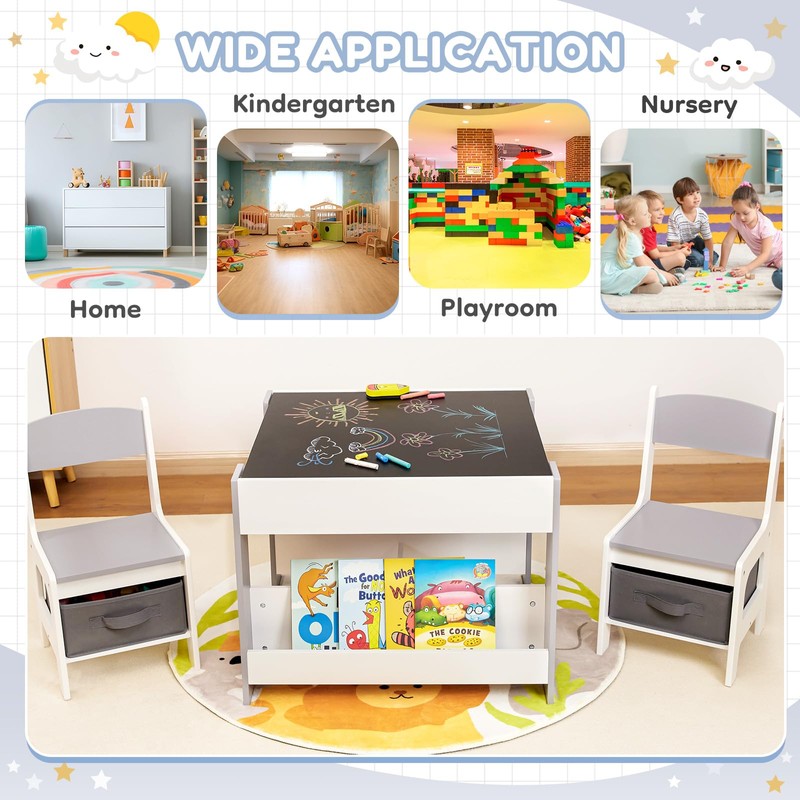 - Versatile 2-in-1 Design: The desktop has a double-sided design with different functions. One side is smooth tabletop for kids to write, read or eat. Turning over is a blackboard that can be painted with chalk, improving children's imagination. With this versatile and multi-functional set, children can easily switch between different activities and never get bored