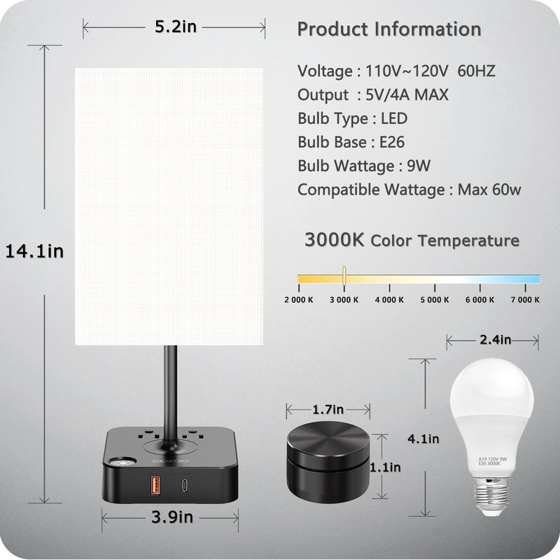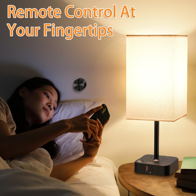 - Upgraded Multifunctional Bedside lamp: Built-in 2 USB charging port and 2 AC outlets,High-end fabric lampshade and 9W LED dimmable remote-control bulb included; Table lamp with 9W dimmer remote control led bulb that can be remotely controlled within 33ft.With the remote control, you can easily control the brightness modes, no need leaving warm bed or sofa.