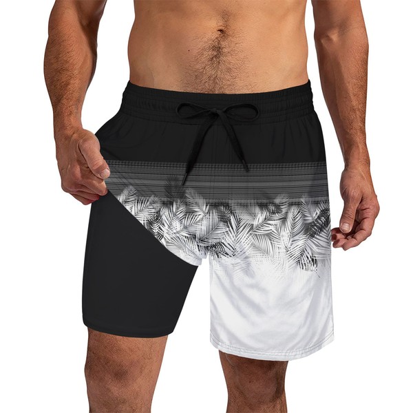 Cozople Men's Swim Trunks with Compression Liner Plam Tree Printed Board Shorts 4-Way Stretch Quick Dry Bahting Suits Running Athletic Beach Shorts