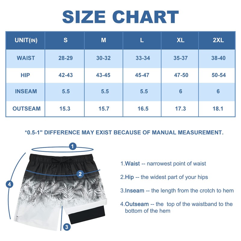 • Mens' Swim Shorts with Compression Liner are available in a variety of styles and sizes. Please refer to the size chart when purchasing. Note: The color may be slightly different under different monitors