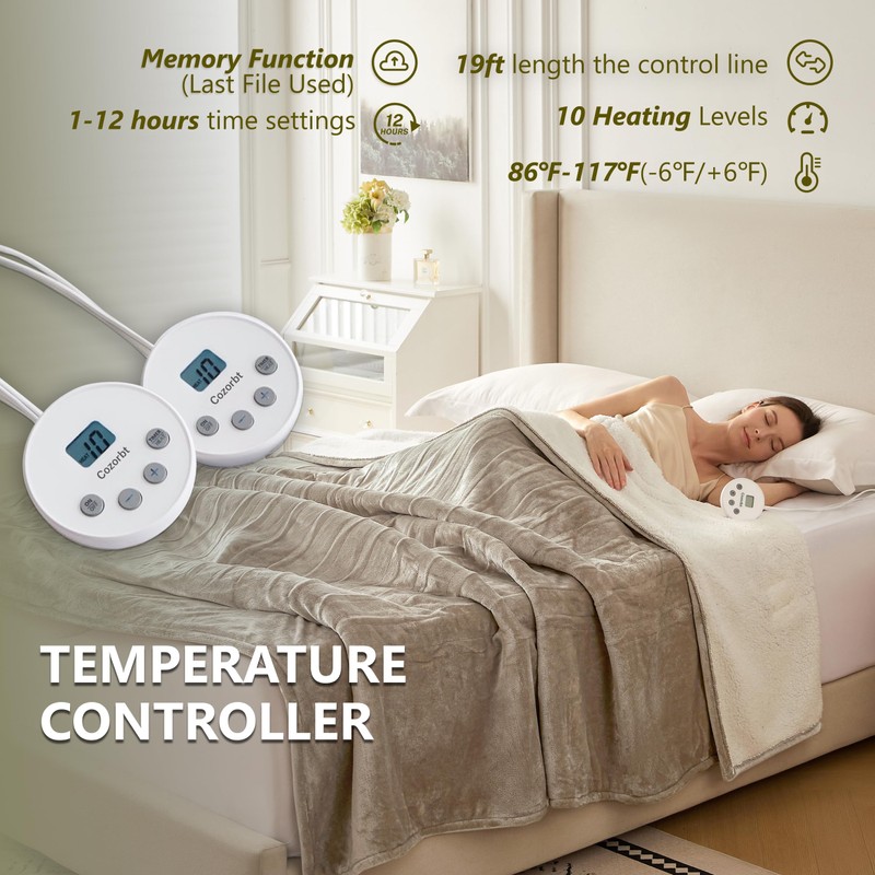 - FAST HEATING: This Cozorbt electric blanket is perfect for your winter warmth needs. With precise 1 - 10 level heat adjustments and a temperature control range of 86-107°F, you can adjust it to your liking whether you prefer a gentle warmth or a more intense heat.The 1 - 12 hour free timer function allows for a variety of usage scenarios, and the default auto shut-off feature ensures that you don't have to worry about forgetting to turn off the power.