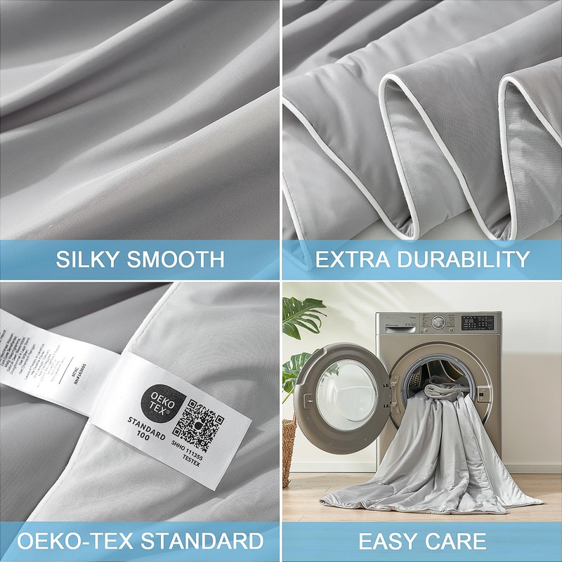 - 【Luxurious Comfort】Crafted from OEKO-TEX certified fabric, the Cozy Bliss cooling quilt features a silky-smooth, glossy finish that's gentle on delicate skin and hair. Filled with 100% poly down alternative, it creates a 3D hollow structure that offers high elasticity and compression, providing a lightweight, feather-like feel. Enjoy the perfect balance of cooling comfort and luxurious softness for a peaceful, restful night's sleep.