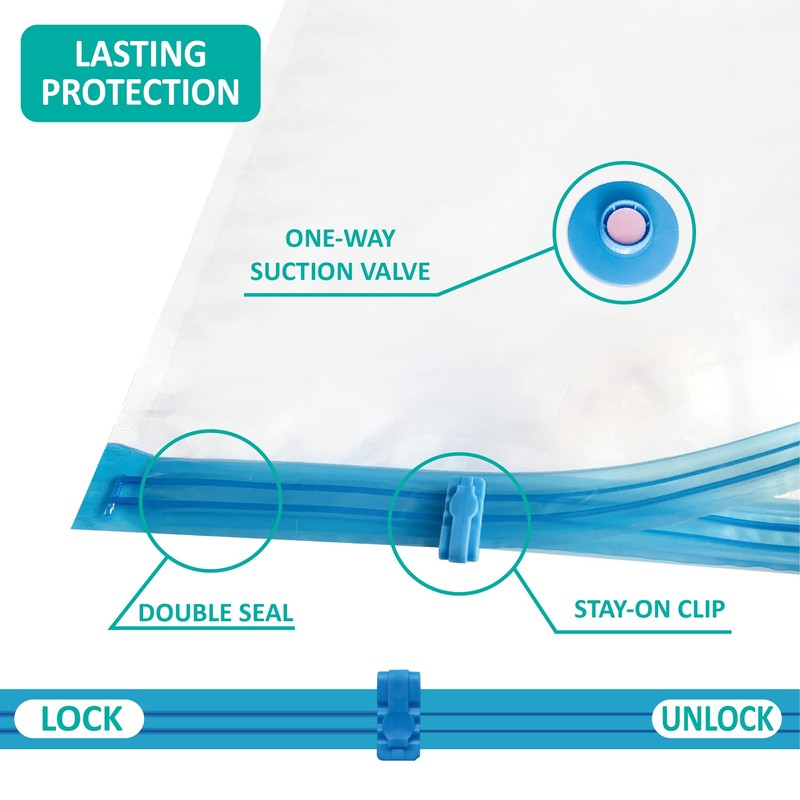 - Reliable protection: With the triple-seal turbo valve & double-zip seal design, our vacuum bags get the air out in the suction process. Can be used repeatedly.