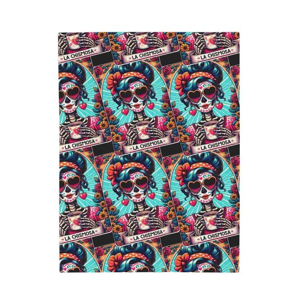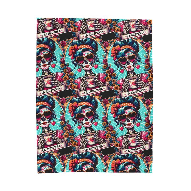 Snuggle up in style with this "La Chismosa" velveteen blanket, featuring a colorful and bold Day of the Dead sugar skull design that brings a playful, cultural touch to any room. Inspired by the tradition of Día de los Muertos, this blanket displays "La Chismosa" sipping her coffee with heart-shaped sunglasses, surrounded by vibrant flowers and intricate details. Ideal for adding warmth and personality to your home decor, this blanket makes a unique gift for loved ones or a special treat for yourself.
