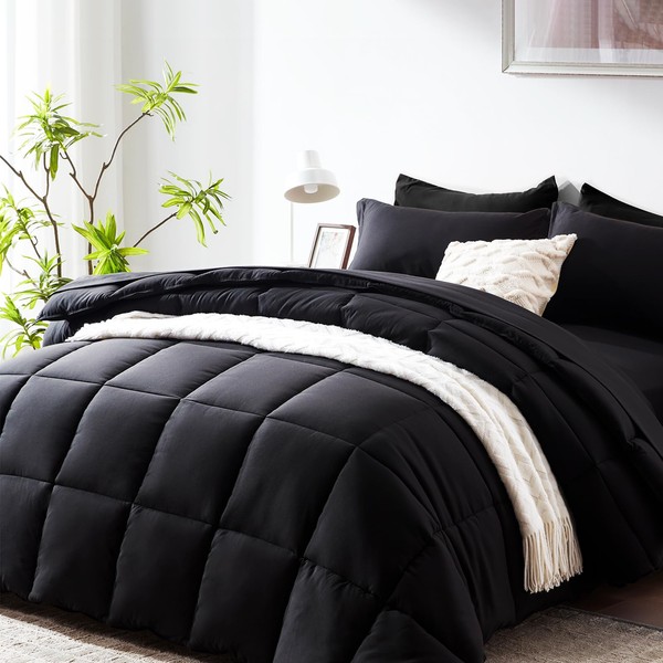 COZYART Full Comforter Set 7 Pcs, Black Bed in a Bag, All Season Lightweight Soft Reversible Bedding Sets, 1 Comforter, 1 Flat Sheet, 1 Fitted Sheet, 2 Pillow Shams, 2 Pillowcases