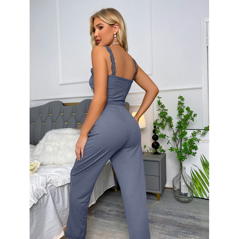 - Características: conjunto de pijama de 2 piezas, ribete de encaje, botón falso, botón frontal, ajuste delgado, sólido, cordón frontal, nudo frontal, sin mangas, tirantes, camisola y pantalones