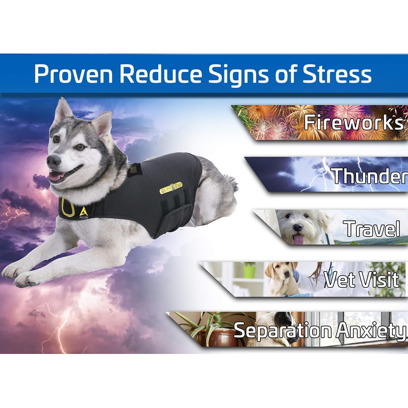 - Calms during fireworks, thunder, separation, travel, vet visits, and much more with no training and no medication so your dog stays drug-free. Great for rescue dogs.
