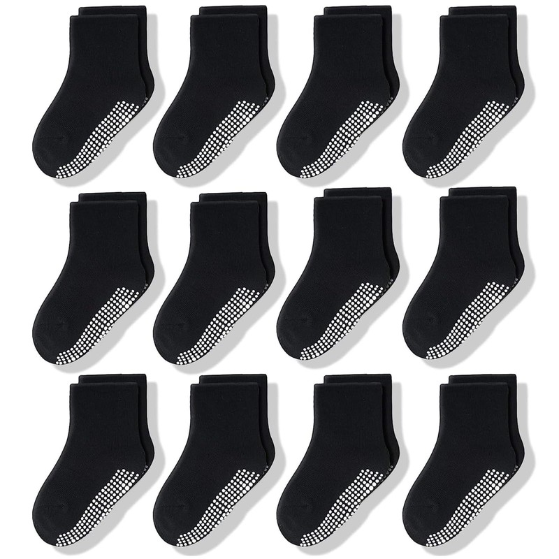 CozyWay Toddler Socks With Grippers Non Slip Crew Grip Socks for Girls and Boys Soft Comfy Cotton - 3T-5T Unisex Black - 12 Pack