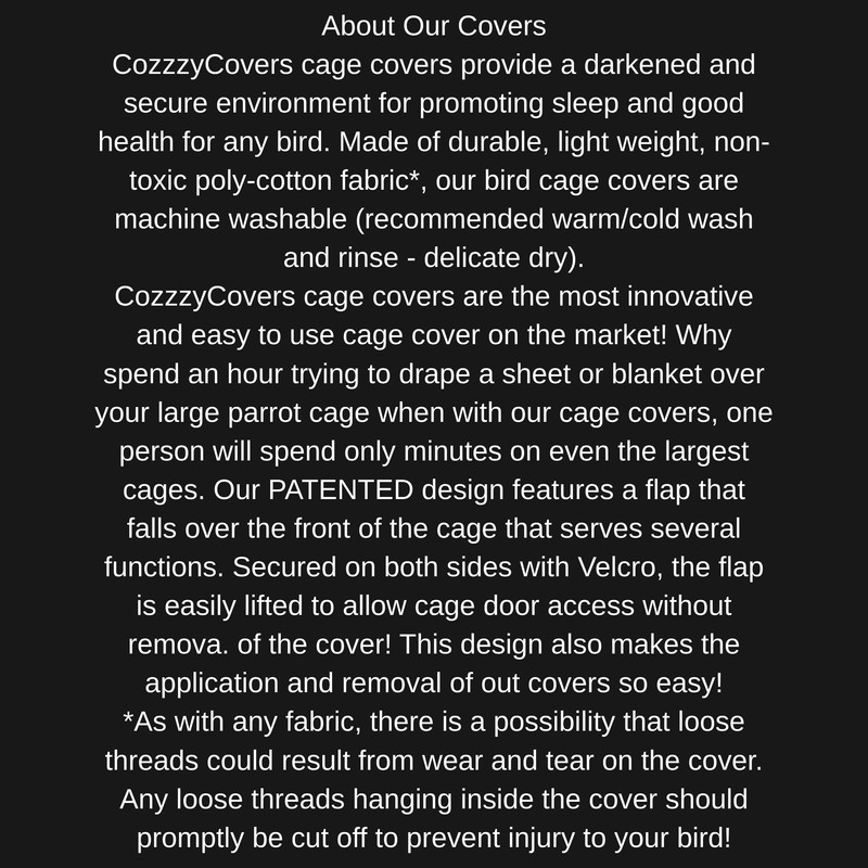 - Machine washable for easy care on a delicate cycle; this cover is a more efficient and cleaner alternative to using blankets or sheets, minimizing mess while supporting bird wellness.