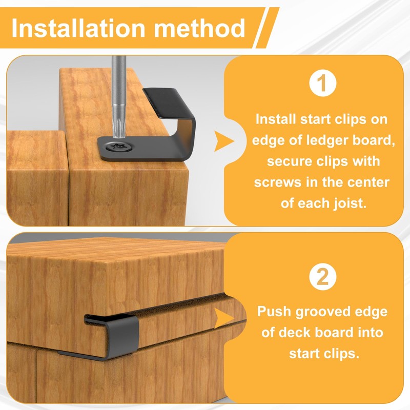 • 【Universal Compatibility】These black starter clips are designed to work with a variety of decking materials. Whether you are laying a composite patio or working with hardwoods, our deck starter clips are the perfect solution. However, some woods are extremely hard and must be drilled before attaching the screw.