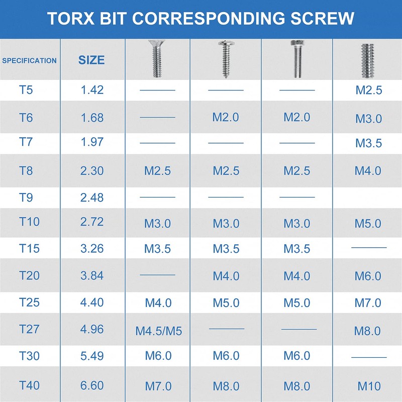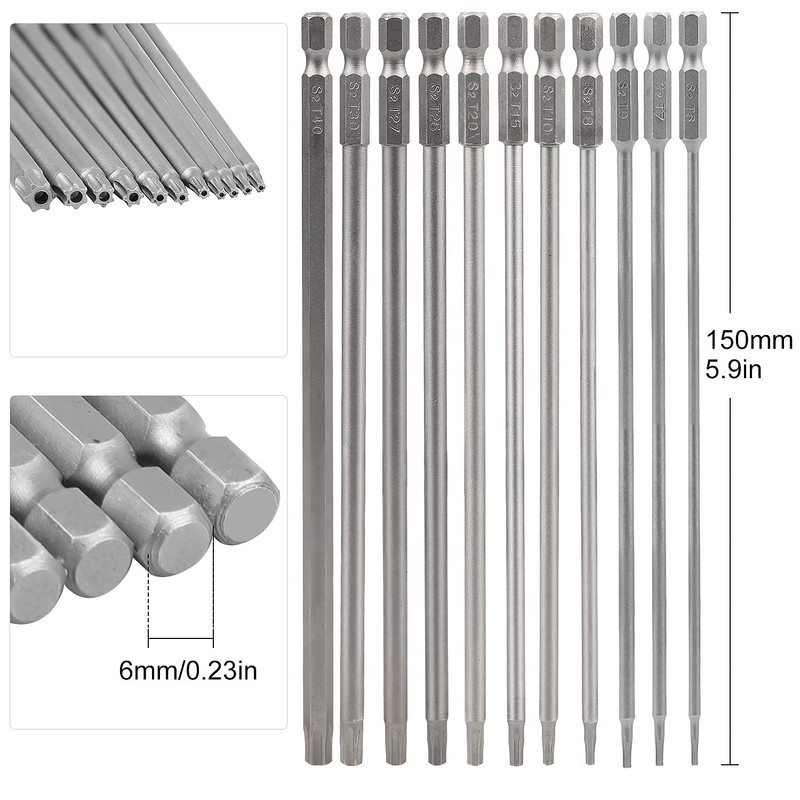 - Package includes: 2 Torx screwdrivers, 11 Torx bits of size 150 mm x 6 mm (T6, T7, T8, T9, T10, T15, T20, T25, T27, T30, T40).