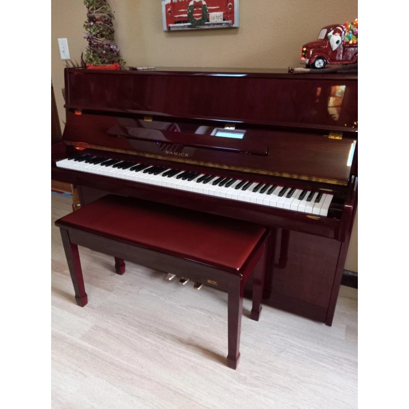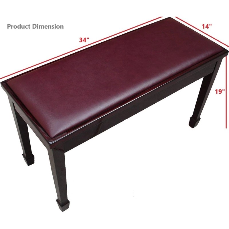 The CPS Piano Bench is the finest quality and highest value piano bench you can buy. It's 34" long, 14" deep and 19" high. (longerthan a standard bench, so two people may sit on the same bench to play a duet.) The bench is made of solid hard wood, the seat is covered with 100% premium genuine leather withwood trim around the perimeter. The leather we use on our bench is the top quality leather you can find. It's made from large pieces of leather. It's thick and soft. Each one is hand picked by our designers to ensure the quality of the leather you expect. There is a very spacious storage compartment. Quick and easy assembly, you just attach the legs with the wrench provided. It weighs about 19 pounds. Available in mahogany color with high gloss (shiny) finish. No Extra Charges for the Spade Legs ($30.00 Value).