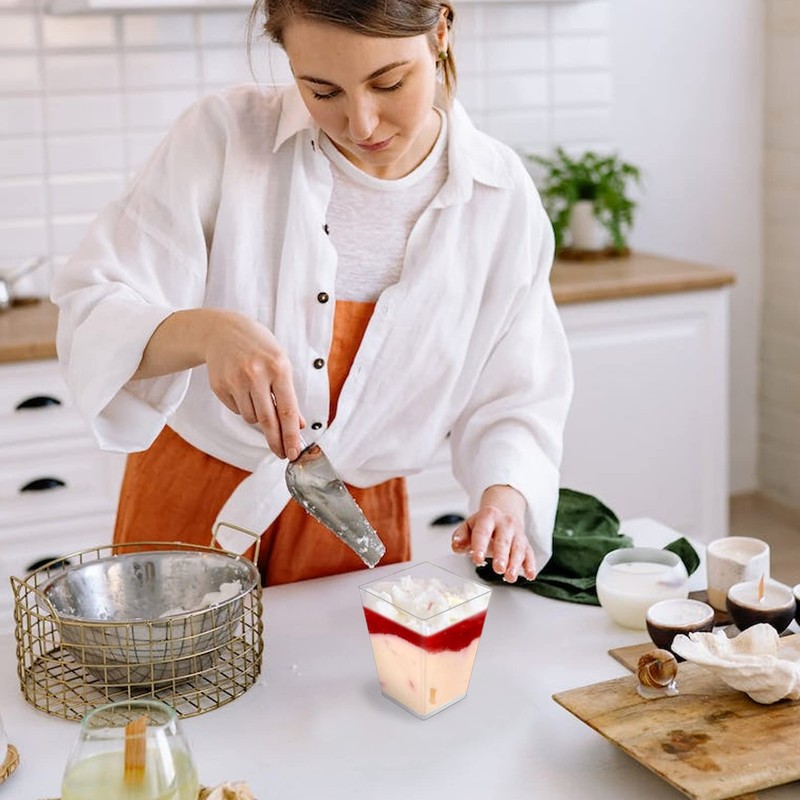 - Transparent Design: Mini dessert cups are adopted simple and generous modern design, elegant and fashion, crystal clear and square body, showcasing and setting off your delicate delicious desserts. Each dessert cup comes with a spoon, which is convenient to enjoy.