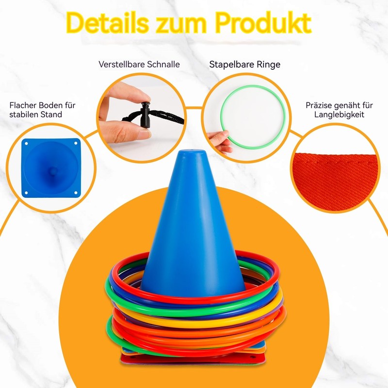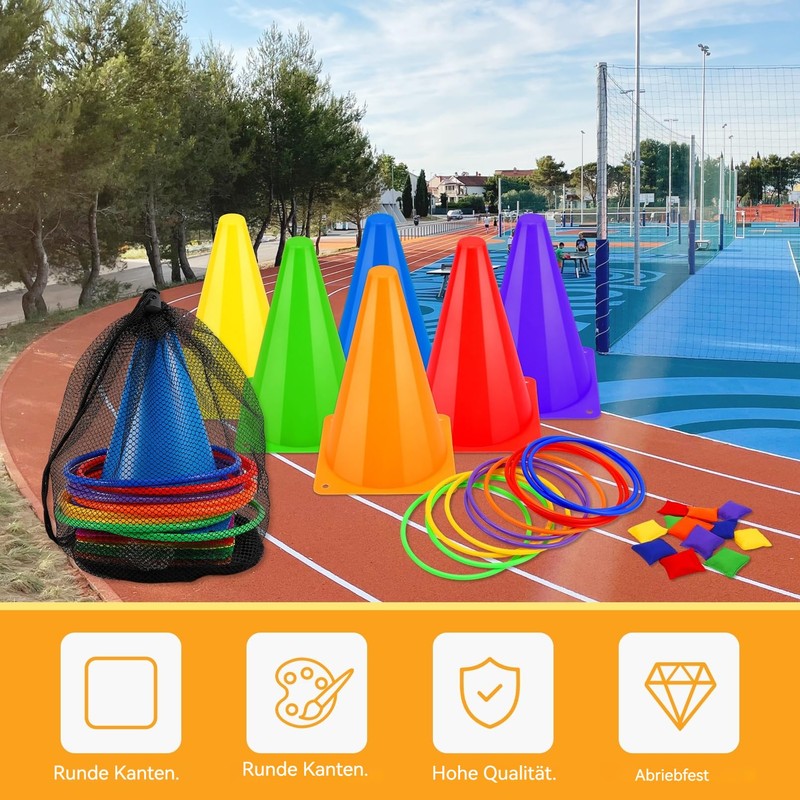 - 3 in 1 carnival game set: you will receive a set of 12 colourful throwing rings, 12 pieces bean bags, 6 pieces traffic cones and 1 piece bag. With a complete and rich assortment of accessories, you can enjoy fun games with your family and friends.