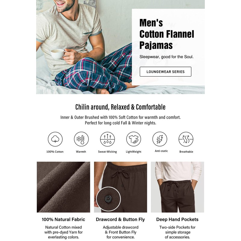 CQR Men's 100% Cotton Plaid Flannel Pajama Pants, Brushed Soft Lounge & Sleep PJ Bottoms with Pockets, Unique HPJ100-DBN_Small