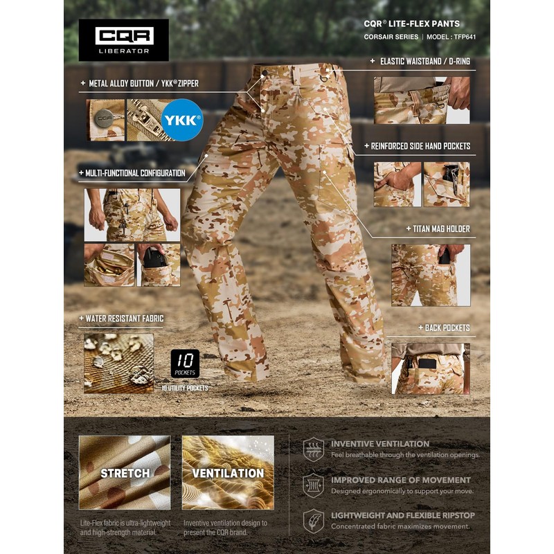 CQR Men's Utility Flex Cargo Pants, Classic-Fit Casual Stretch Work Pants, Water Resistant Lightweight Tactical Hiking Pants, Tac Utility Camo Dune, 32W x 32L