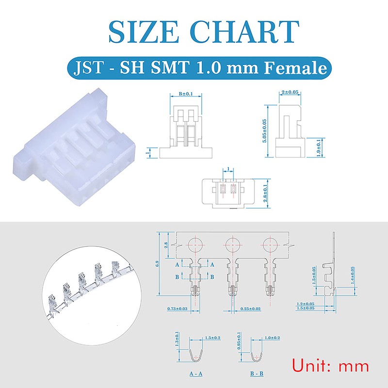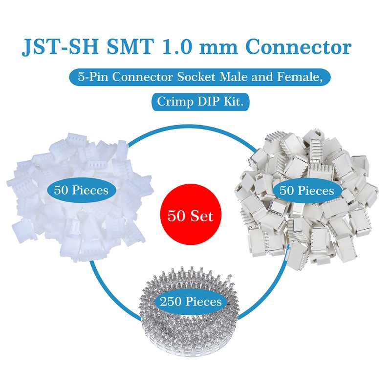 - 50 sets / 350 pieces JST SH SMD 1.0 mm pitch 5-pin JST connector kit. Packed in a PP material packaging box.