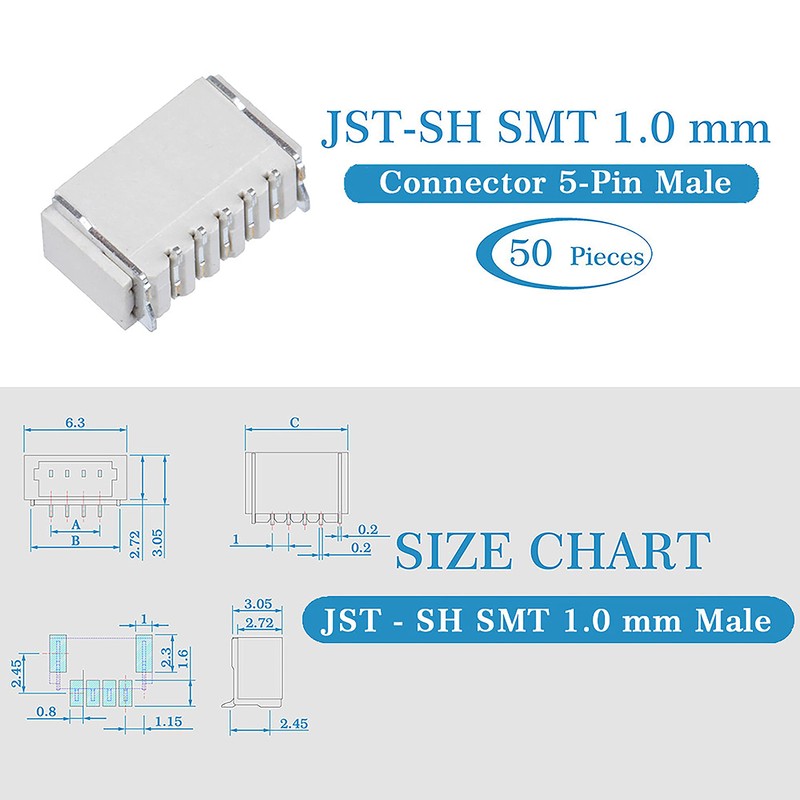 - Pack of 50 JST SH SMD 1.0 mm pitch 5-pin male connector plug.