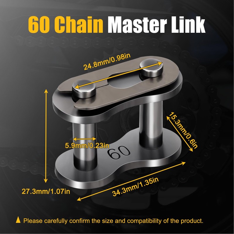 - 【Tips】Before purchasing, please carefully confirm the size and compatibility of the product. We recommend regularly cleaning and lubricating the 60 chain master link to maintain its performance. Following these simple maintenance steps will ensure your chain provides reliable service for a long time.