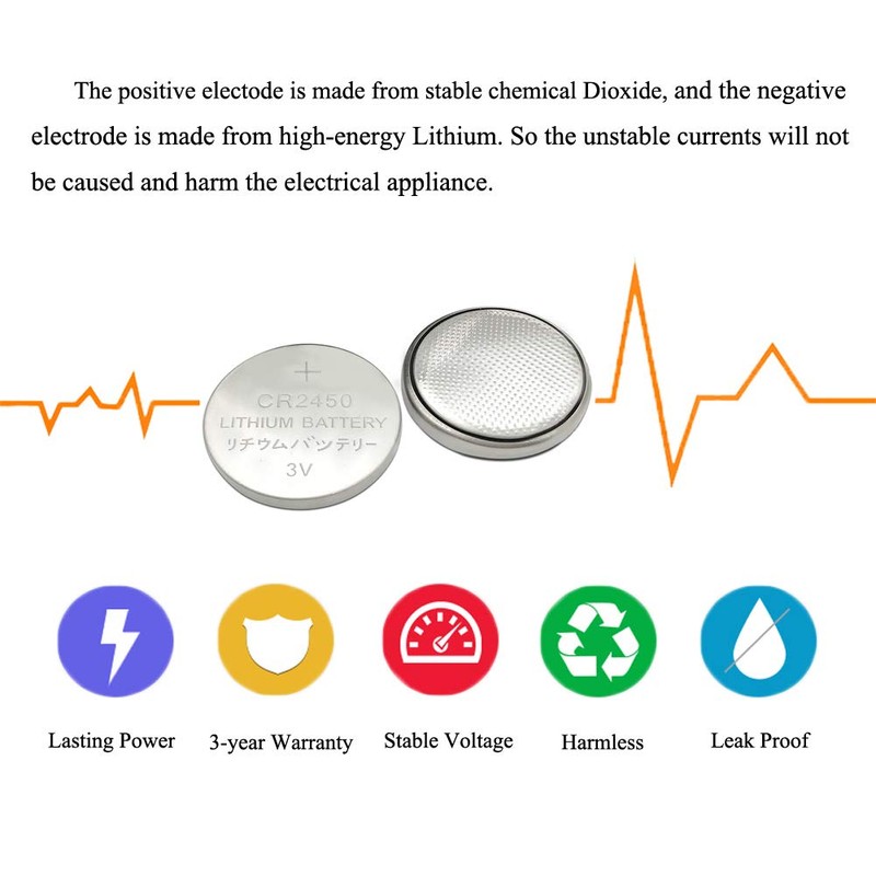 • High Quality: Our lithium coin battery CR2450 are not leaking, corroding, or otherwise failing. It is reliable and designed to service your devices for a t least two years, You will get more battery time and value for money with our quality CR2450 Lithium cells