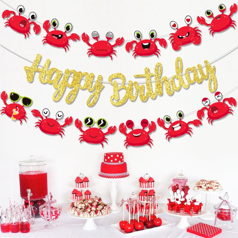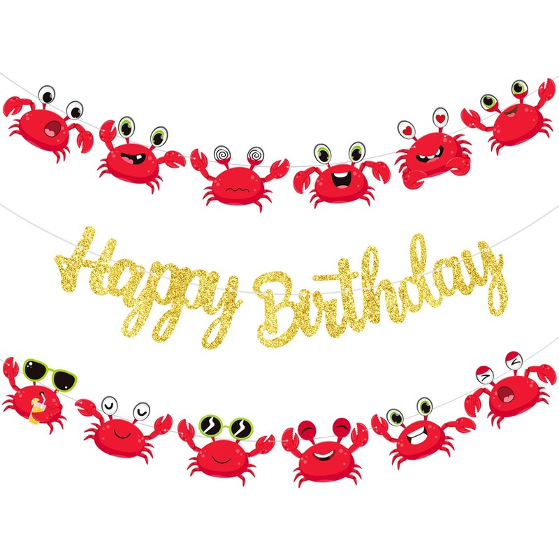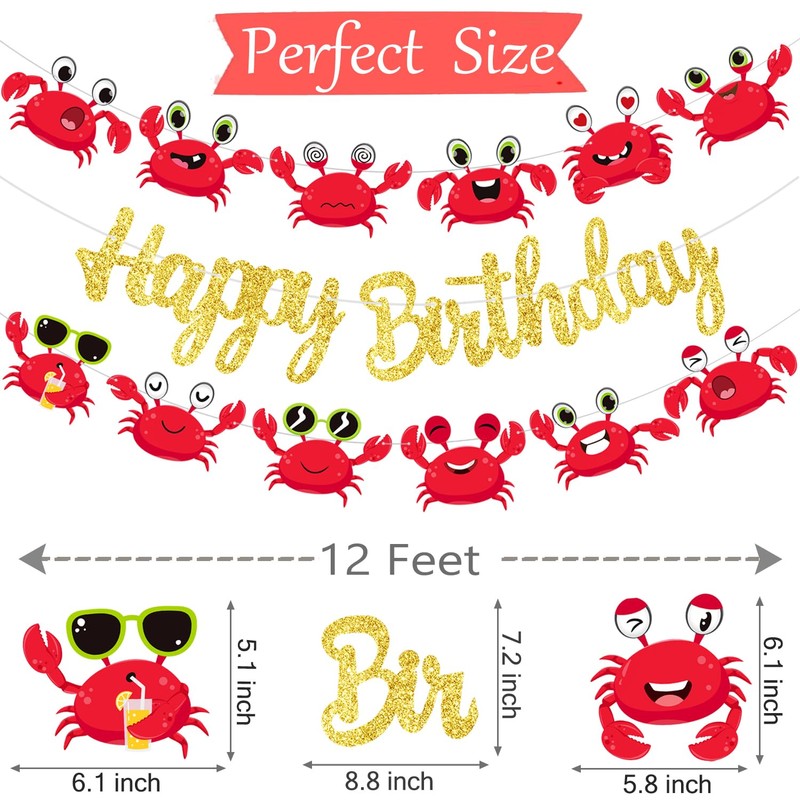 - Glitter gold happy birthday sign:2Pcs lovely red crab cutout banners pair with 1pcs glittery gold happy birthday banner. The dazzling pairing not only surprises your guests but is full of good wishes. Ignite the mood of your party now