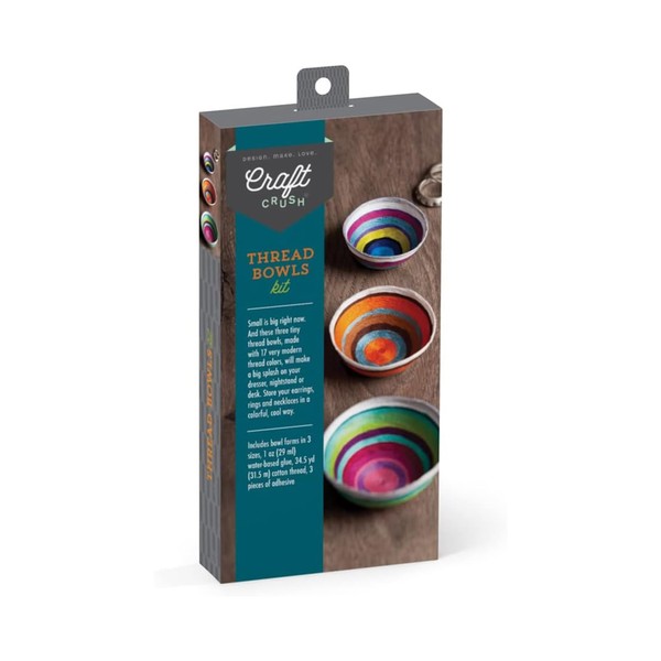 Making the Craft Crush Thread Bowls is both fun and easy. First, choose a color from the 17 stylish threads – or pick two! There are no limits on creativity here. Using the supplied adhesive, wrap the thread around one of the forms to create a bowl with a color and design that is uniquely you. We’ve done the legwork for you, collecting everything you’ll need to make the 3 bowls - 3 bowl forms in 3 sizes, 3 adhesive sheets, 1 ounce of water-based glue, and 34.5 yards (31.5 m) of cotton thread. Get ready to be bowled over!