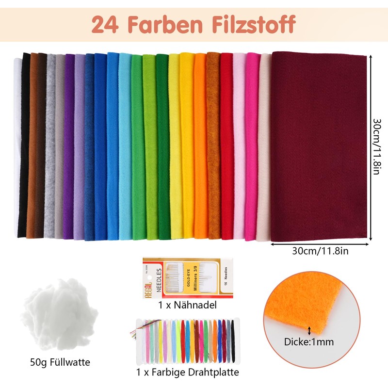 - Colorful series: felt fabric is available in 24 bright colors, with 3 sewing accessories: 1 x colored wire plate, 1 x sewing needle, 50g high pile filling wadding that meets the needs of all craftsmen