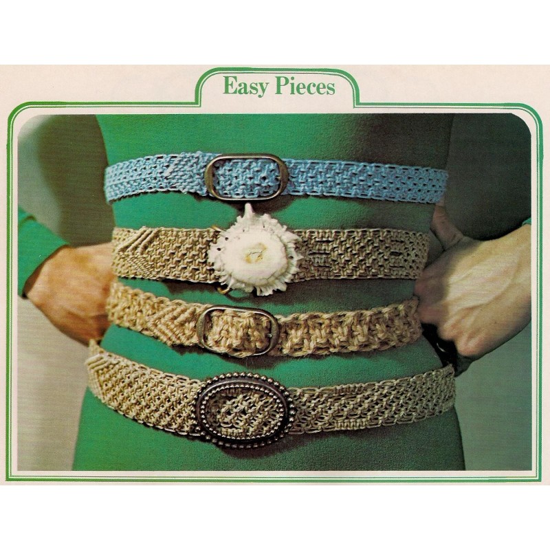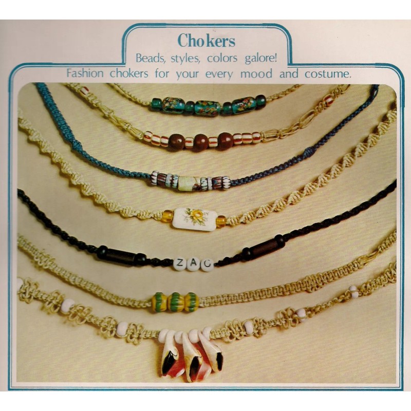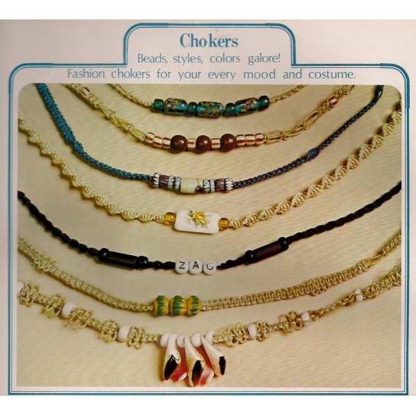 23 pages Macramé Jewelry and Belts Projects Include: A Medley of Strings, Chinese Crown Collar and Bracelet, Composition by the Sea, Green Looping, Olive Wood Necklace (w/variation), Show Piece, Spanish Lace, Belts and Chokers |