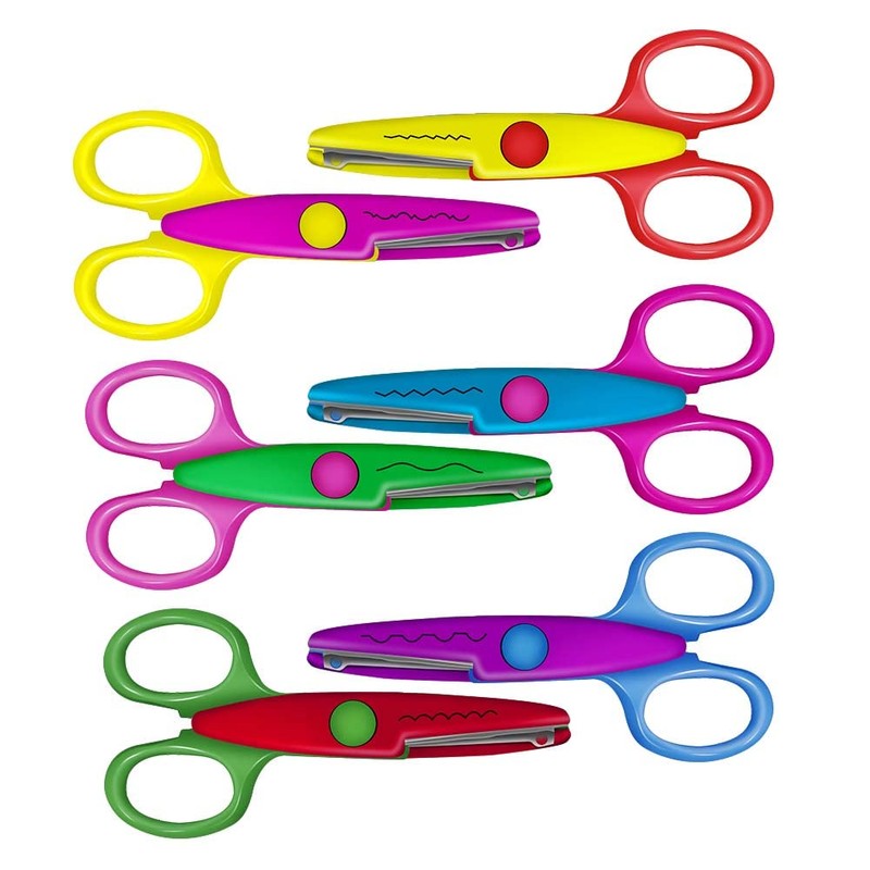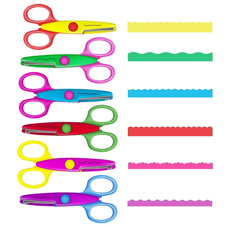 - Children's scissors: each craft scissors have a unique pattern and a bright colour design. 6 different trimmers: castle, postmark, semicircle shaft, small sawtooth, large sawtooth, large shaft. There are different shapes and designs available that offer unlimited design possibilities for your craft.