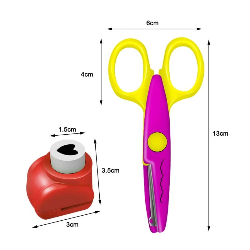 Material: plastic + metal kids craft scissors: 13.5 x 6.1 cm (5.3 x 2.4 inches) paper punch set: 2.5 x 3 x 3.2 (0.89 x 1.2 x 1.25 inches).
