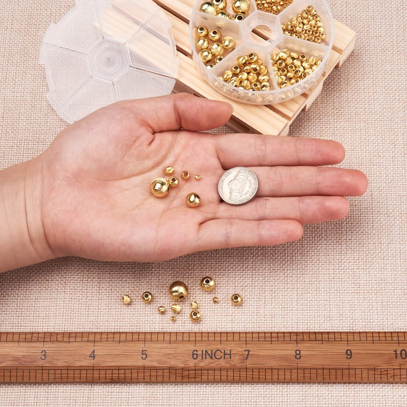 - Package Included: 198pcs brass round beads, includes 60pcs in 2.7~3mm (0.1 - 0.11”), 50pcs in 3.5mm (0.13”), 40pcs in 4.5mm (0.18”), 30pcs in 5.5mm (0.21”), 10pcs in 7.6mm (0.29”) and 8pcs in 10mm (0.39”). The hole is about 1~2.5mm.