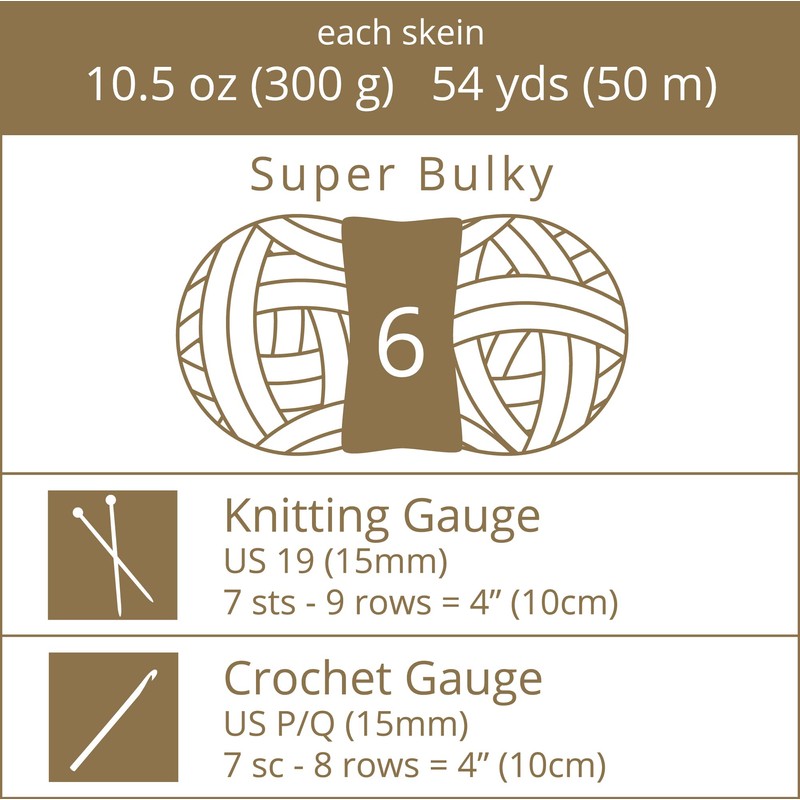 - Crochet Gauge: US P/Q (15mm), 7 sc - 8 rows = 4” (10cm)