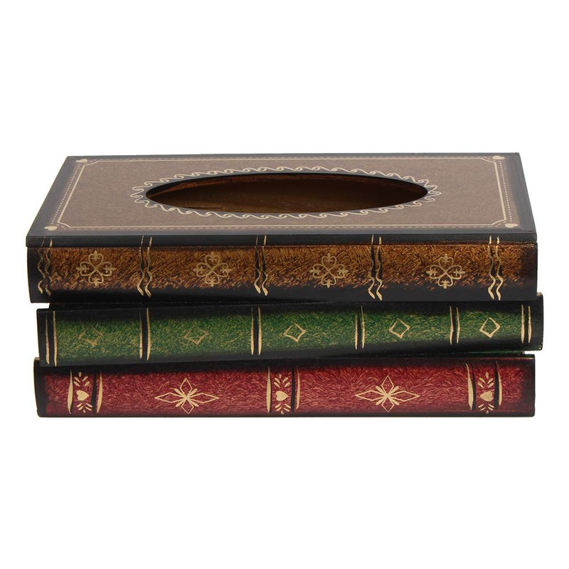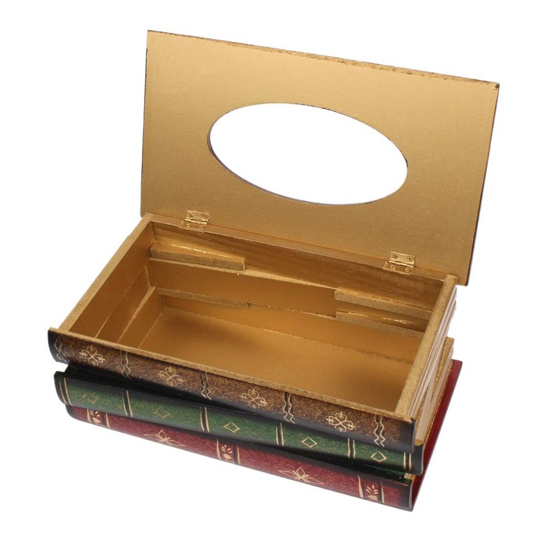Material: Wooden; The other side of the tissue holder has the gold edges of the books.
